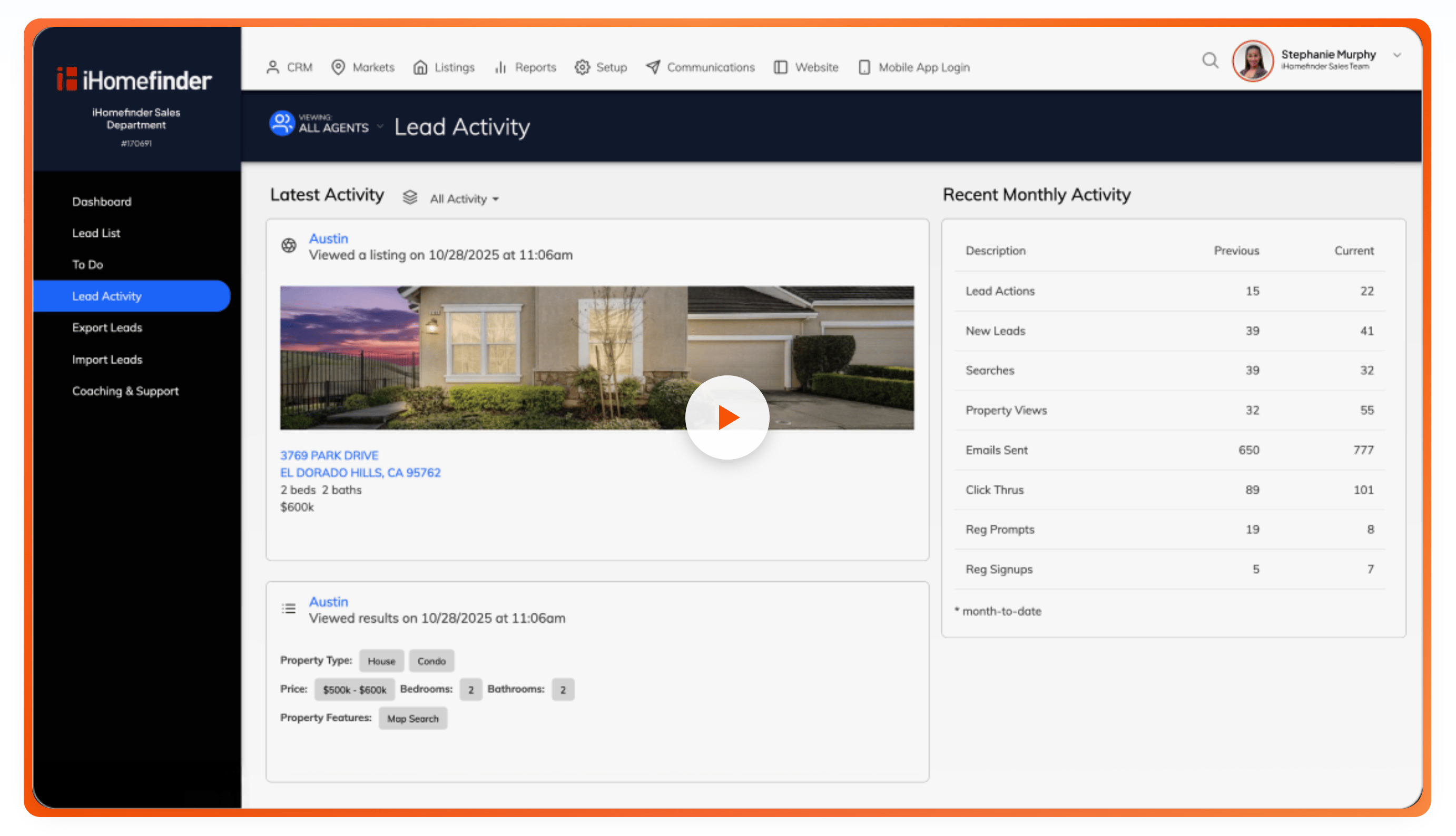 The practical value: instead of calling leads in the order they signed up, you call the ones the system has identified as most active. A lead who registered six months ago and spent 45 minutes searching last night is a different conversation than a lead who submitted a form once and never came back. iHomefinder tells you which is which before you dial.